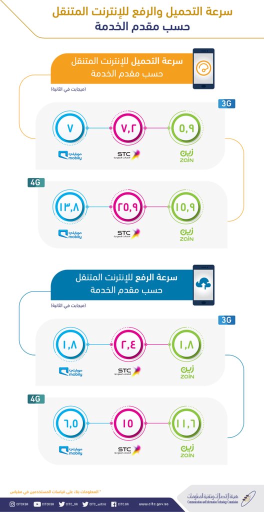 وبلغت سرعة الرفع في الجیل الثالث لشركة “4.2” STC میجابت في الثانیة فیما تساوت “موبايلي” و”زين” بسرعة 8.1 میجابت، وبلغت في الجیل الرابع لشركة “15” STC میجابت فیما بلغت في “زين” 6.11 میجابت و”موبايلي” 5.6 میجابت.