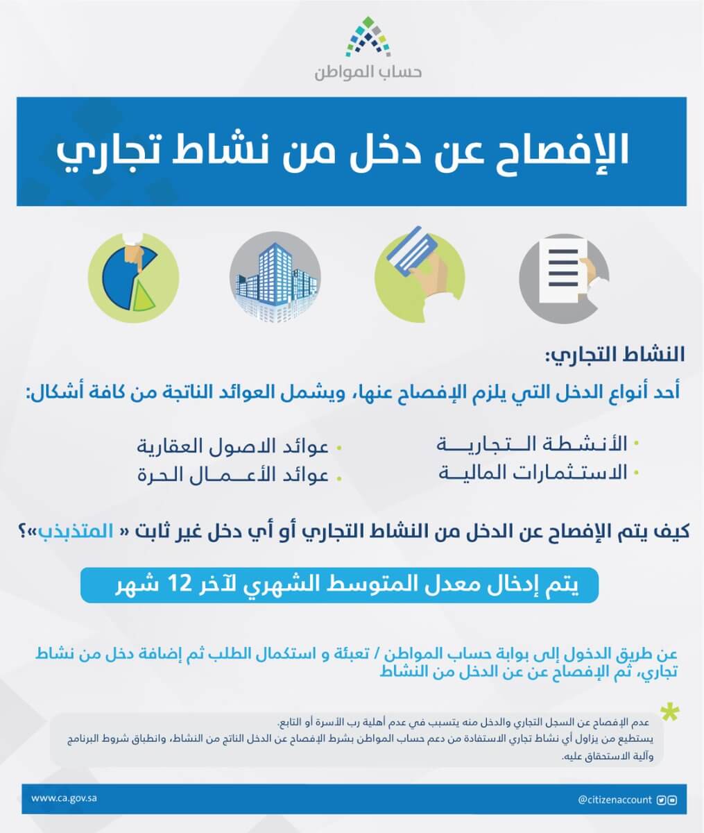 أعاد برنامج حساب المواطن ، اليوم الثلاثاء، التذكير بكيفية الإفصاح عن أي دخل من نشاط تجاري في الحساب.