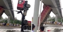 ويمكن رؤية الشاحنة مقلوبة عموديًّا بعد أن حُشرت المقطورة بين الكوبري والطريق.