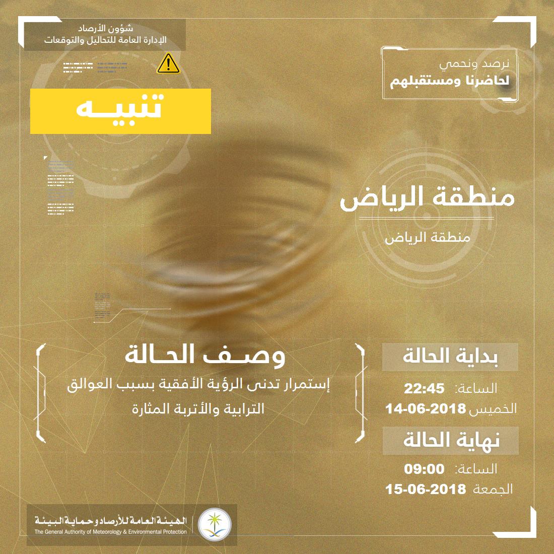 وأوضحت الأرصاد في تنبيه متقدم لها عبر حسابها الرسمي بموقع “تويتر” أن الحالة عبارة عن استمرار في تدني الرؤية الأفقية بسبب العوالق الترابية والأتربة المثارة، بدأت في تمام الساعة العاشرة و45 دقيقة.