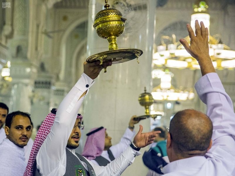 جهزت الرئاسة العامة لشئون المسجد الحرام والمسجد النبوي ، ممثلة بوحدة الطيب والبخور “60” مبخرة يومياً لتطييب وتبخير المسجد الحرام والكعبة المشرفة ، بالإضافة الى تٌطيب الحجر الأسود والملتزم بدهن العود الفاخر خمس مرات يومياً وبأكثر من خمسة كيلوات من دهن العود ويكون ذلك على مدار الساعة .