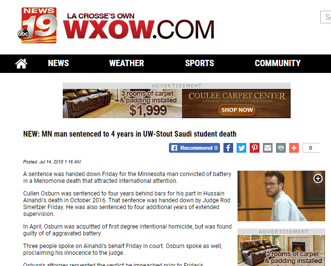 تلقى كولن أوسبورن المتهم بجريمة قتل الطالب حسين سعيد النهدي المبتعث في جامعة ويسكونسن ستاوت في مدينة مينابوليس، أمس الجمعة، حُكماً رسميًا بالسجن لمدة 8 سنوات فقط؛ ليُسدل الستار على القضية التي أثارت استياء واضحاً بشأن بعض مظاهر العنصرية.