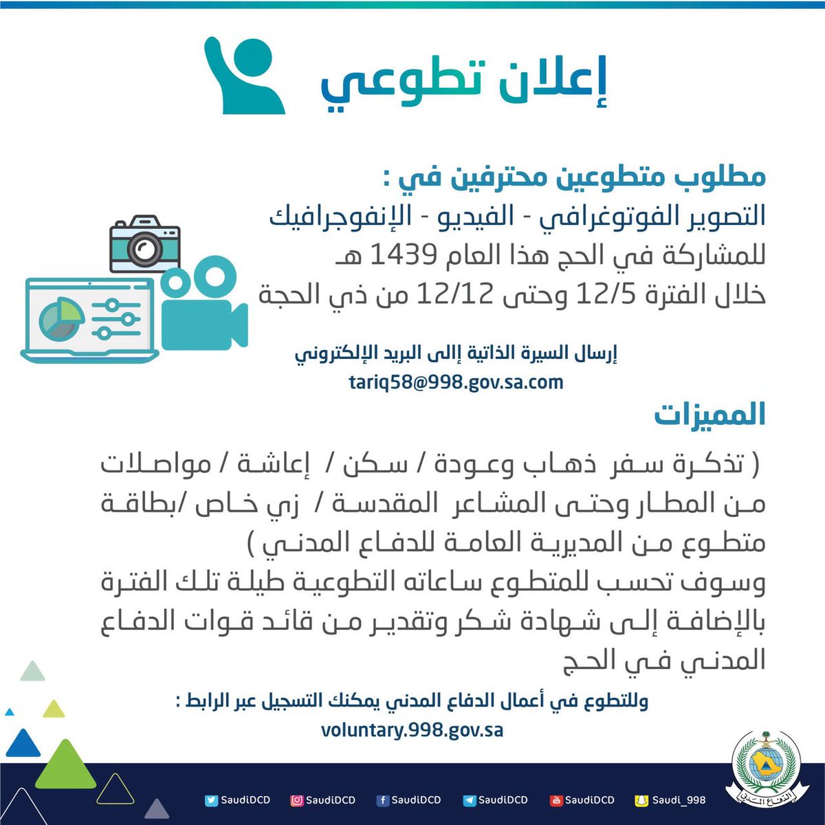وأوضح المدني، في تغريدة له عبر حسابه الرسمي بموقع “تويتر”، أن باب التطوع مفتوح في أعمال (التصوير الفوتوغرافي، الفيديو، الإنفوجرافيك).