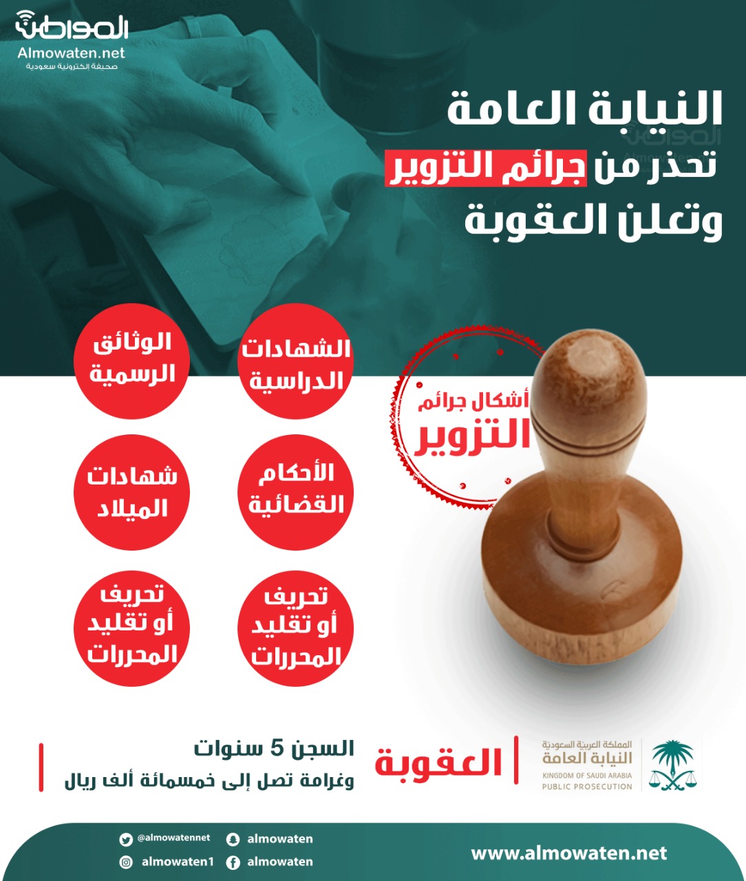 وأضافت النيابة العامة، أن عقوبة المتورط في هذه الجريمة، السجن 5 سنوات وغرامة تصل إلى 500 ألف ريال.