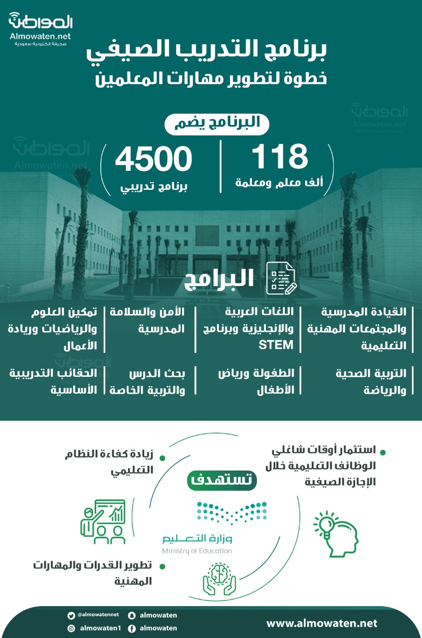 سلطت صحيفة “المواطن“، بالإنفوجرافيك الضوء على برنامج التدريب الصيفي، والذي يعد خطوة مهمة لتطوير مهارات المعلمين.
