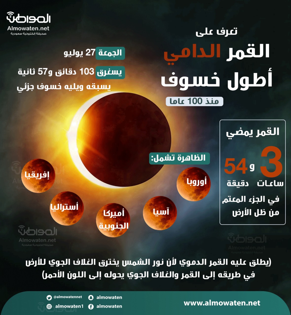 يذكر أن هذه الظاهرة الكونية هي أطول خسوف كلي للقمر منذ 100 عام، وتعرف باسم القمر الدامي، ومن المتوقع أن تستغرق 103 دقائق و57 ثانة، ويسبقه ويليه خسوف جزئي.