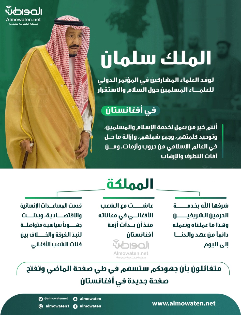 سلطت صحيفة “المواطن“، بالإنفوجرافيك الضوء على توجيهات خادم الحرمين الشريفين الملك سلمان بن عبدالعزيز لوفد العلماء المشاركين في المؤتمر الدولي للعلماء المسلمين حول السلام والاستقرار في أفغانستان.