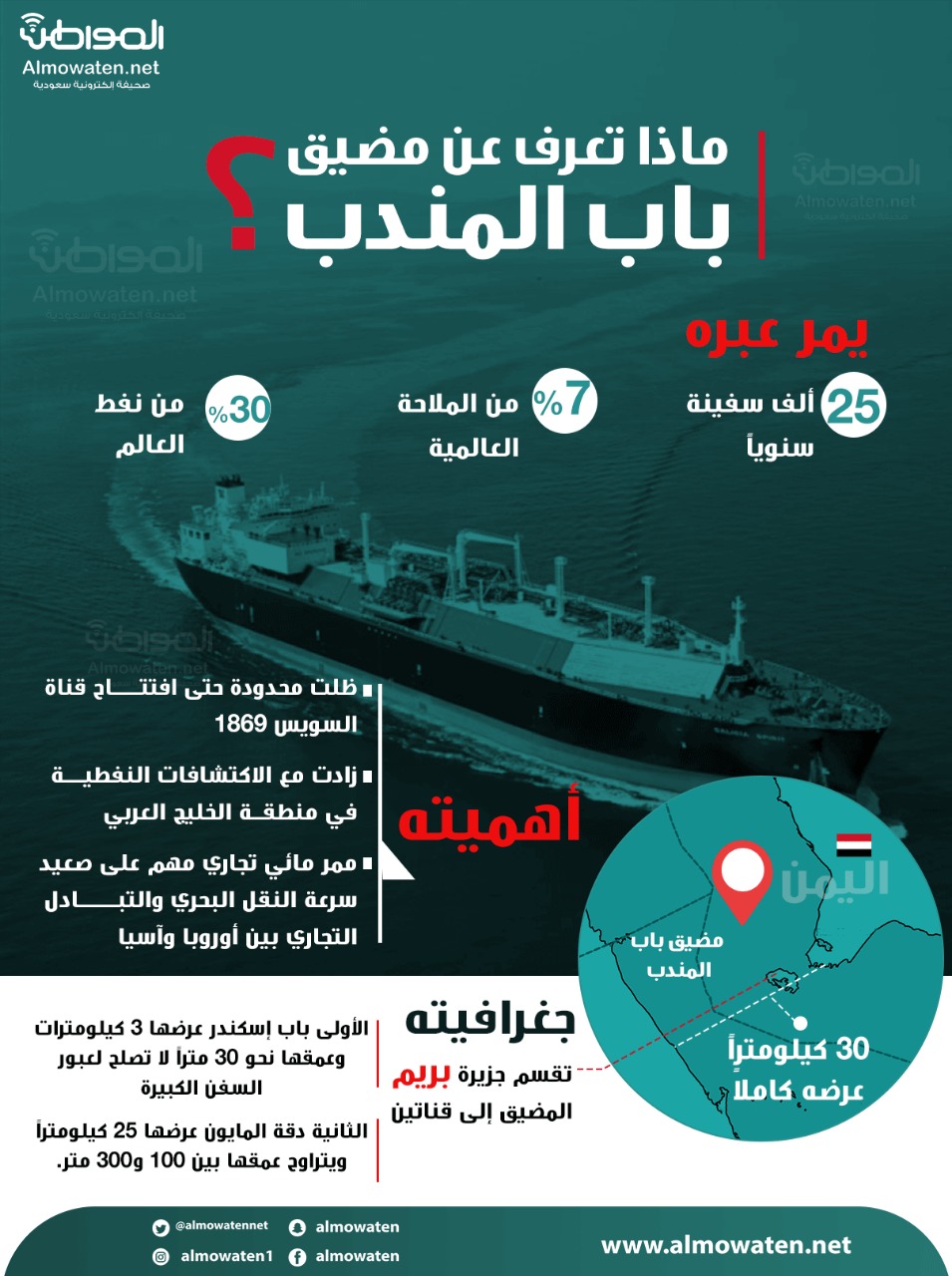 سلطت صحيفة “المواطن“، بالإنفوجرافيك الضوء على أهمية مضيق باب المندب بالنسبة للملاحة الدولية، وخطورة تهديد الملاحة في هذا الشريان البحري الهام من قبل ميليشيا الحوثي الانقلابية.