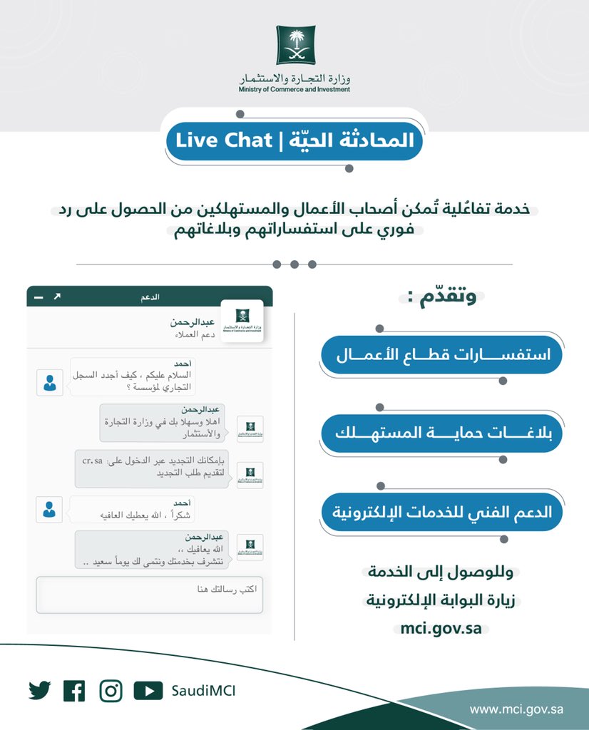 وتمكّن الخدمة الجديدة المستفیدين من الحصول على رد فوري في استفسارات قطاع الأعمال، ورفع بلاغات المستھلك، كما تقدم الدعم الفني للخدمات الإلكترونیة.