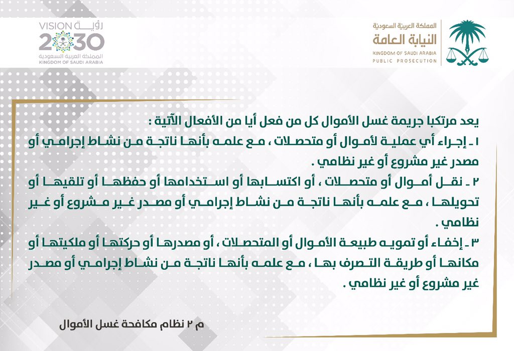 وأوضحت النيابة، في تغريدة لها عبر “تويتر”، مساء اليوم الاثنين، أن الأفعال هي إجراء أي عملية مصرفية أو مالية لها، أو نقلها أو استخدامها أو حفظها أو تلقيها أو تحويلها، وثالثًا إخفاء أو تمويه طبيعتها، أو مصدرها أو ملكيتها.
