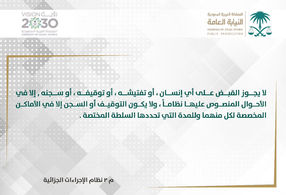 وشددت النيابة، عبر حسابها الرسمي بموقع “تويتر”، على أن من حق أي شخص عدم القبض عليه، أو تفتيشه، أو توقيفه، أو سجنه إلا في الأحوال المنصوص عليها نظامًا.