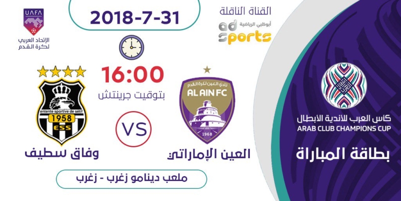 ومن المُقرر أن تُذاع مباراة العين الإماراتي ووفاق سطيف الجزائري في ذهاب دور الـ32 بكأس العرب للأندية الأبطال قناة أبو ظبي الرياضية الناقل الحصري للبطولة.