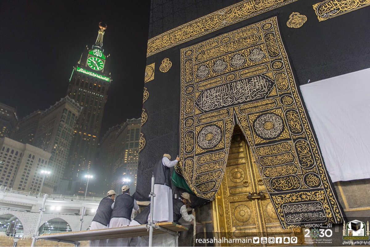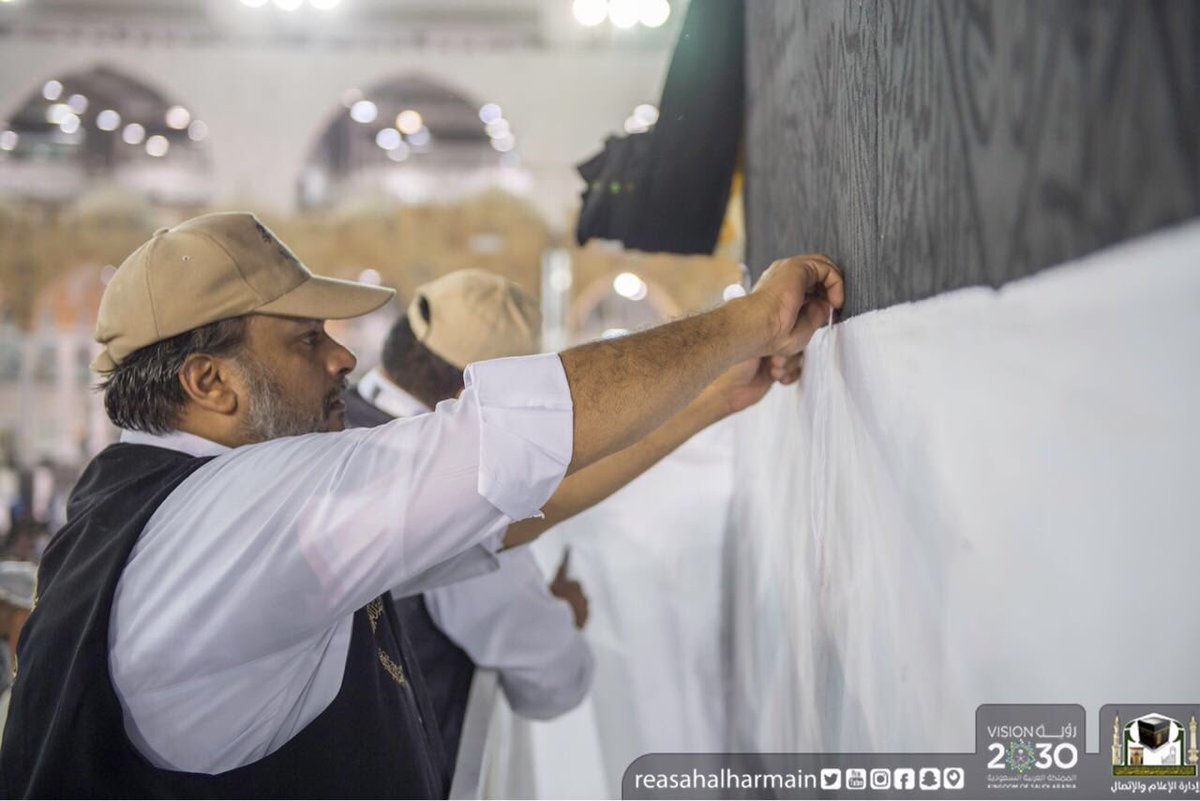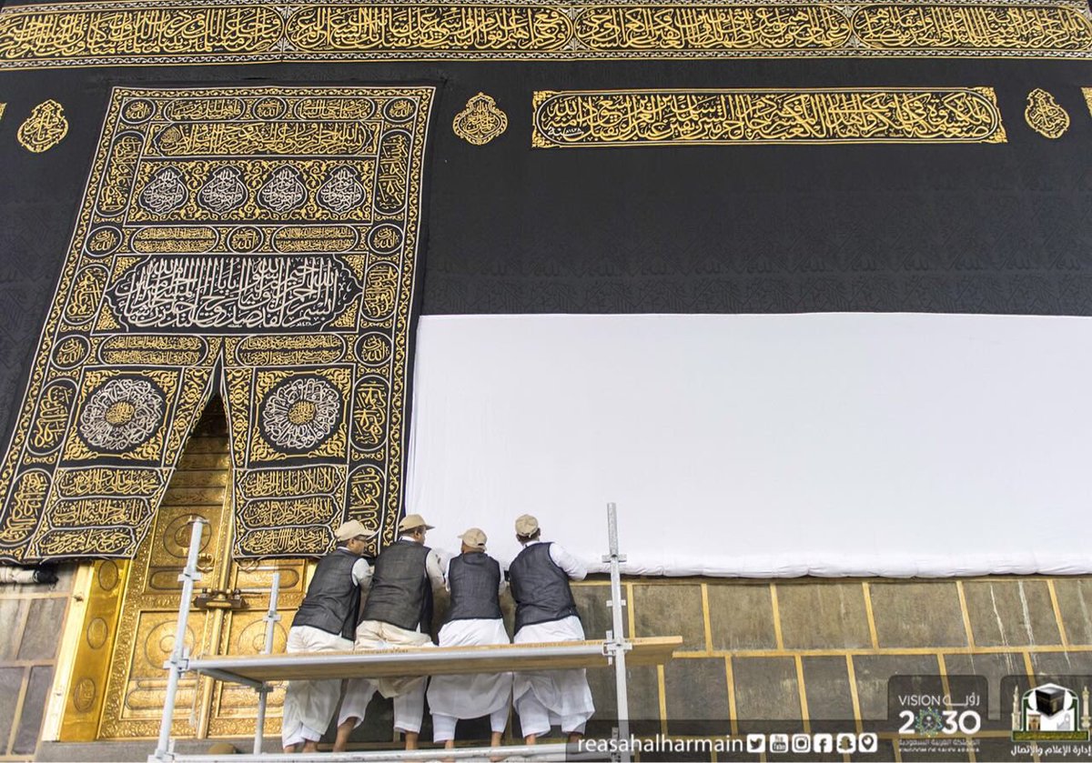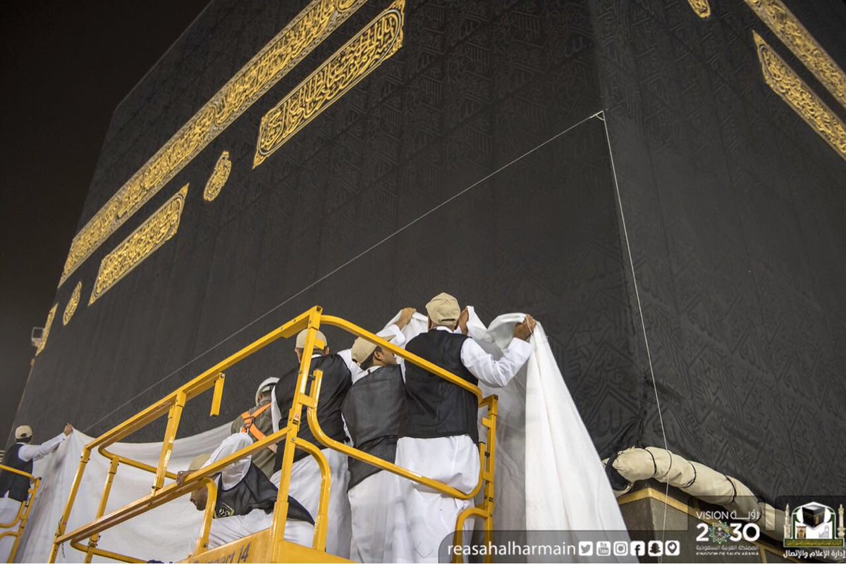 ونشرت رئاسة شؤون الحرمين عبر حسابها في “تويتر”، مجموعة من الصور لمشاهد رفع الجزء السفلي من كسوة الكعبة المشرفة.