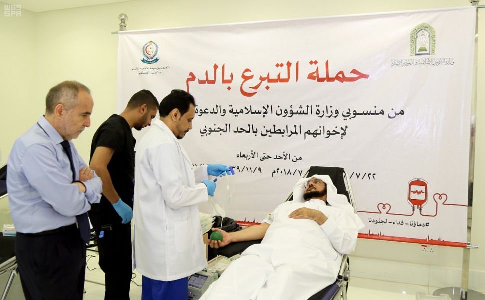 دشّن معالي وزير الشؤون الإسلامية والدعوة والإرشاد الشيخ الدكتور عبداللطيف بن عبدالعزيز آل الشيخ، اليوم , حملة التبرع بالدم لجنود الوطن المرابطين بالحد الجنوبي التي تنظمها الوزارة بالتعاون مع مدينة الأمير سلطان الطبية العسكرية، في مقر الوزارة بالرياض وتستمر لمدة أربعة أيام .