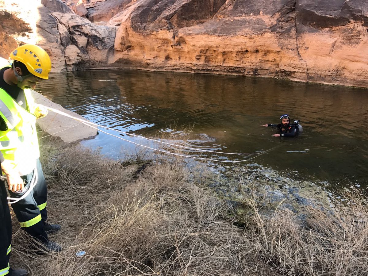 باشر فرع الدفاع المدني بمنطقة تبوك، اليوم الأحد، حالة سقوط مواطن بمستنقع مياه بمنطقة جبلية نائية.