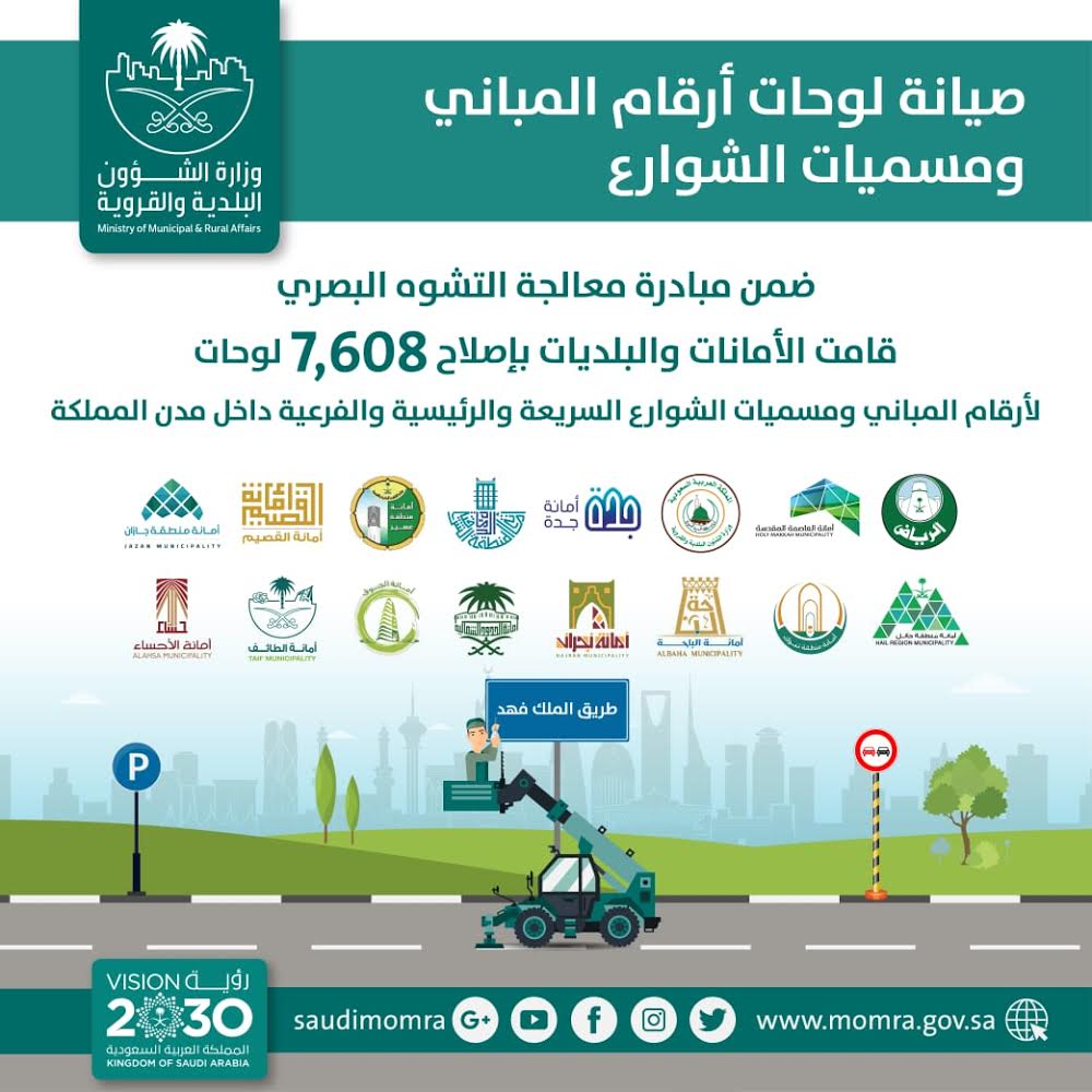 في إطار حملة وزارة الشؤون البلدية والقروية لمعالجة مظاهر التشوّه البصري وتحسين المشهد الحضري، وضمن جهودها لتحسين الطرق وشبكات الخدمات العامة، باشرت الأمانات والبلديات التابعة لها بمختلف مناطق ومحافظات المملكة إصلاح 7608 لوحات لأرقام المباني ومسميات الشوارع السريعة والرئيسية والفرعية داخل المدن السعودية.