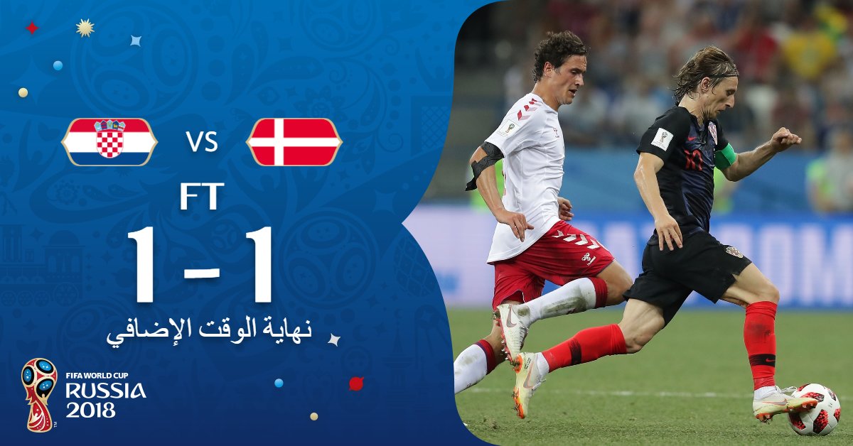 انتهت– منذ قليل– الأشواط الإضافية في مباراة كرواتيا والدنمارك، ضمن منافسات دور الـ16 بنهائيات كأس العالم 2018، بالتعادل الإيجابي بين المنتخبين، ليلجأ الحكم إلى ركلات الجزاء لحسم هوية المتأهل إلى ربع نهائي المونديال الروسي.