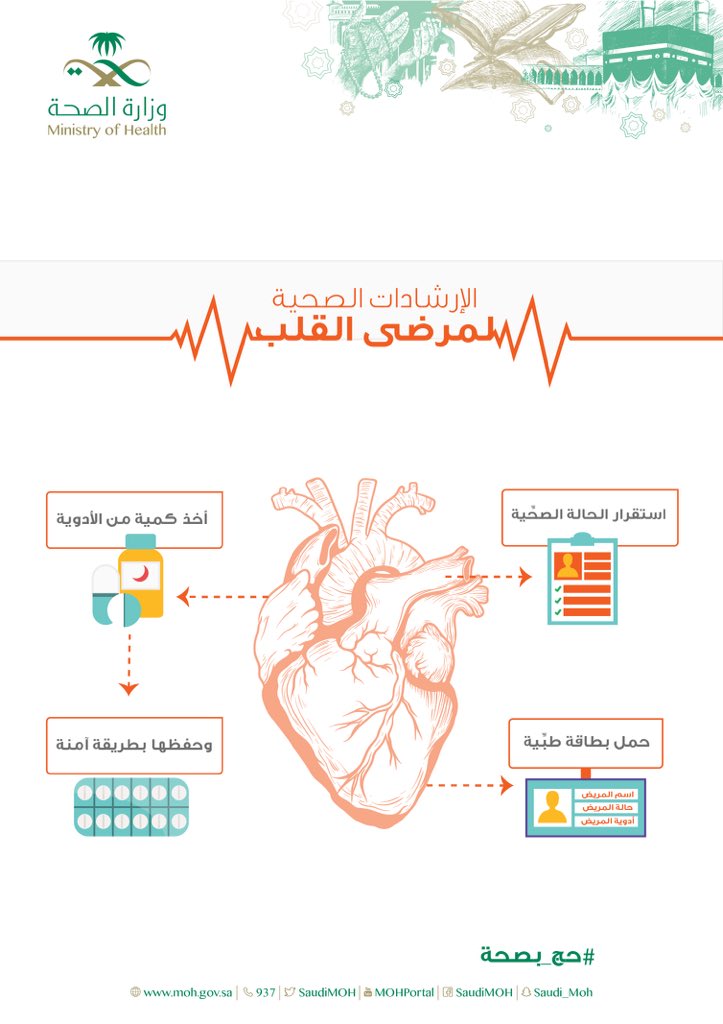وأوضحت وزارة الصحة أنه “في حال كنت مصابًا بالقلب وتنوي الحج فيجب استشارة الطبيب مع اتباع النصائح التالية.. حمل بطاقة طبية مبين فيها اسم المريض وحالة المريض والأدوية الخاصة به، مع أخذ كمية من الأدوية، وضرورة حفظ الأدوية بطريقة آمنة، وأخيرًا يجب التأكد من استقرار الحالة الصحية”.