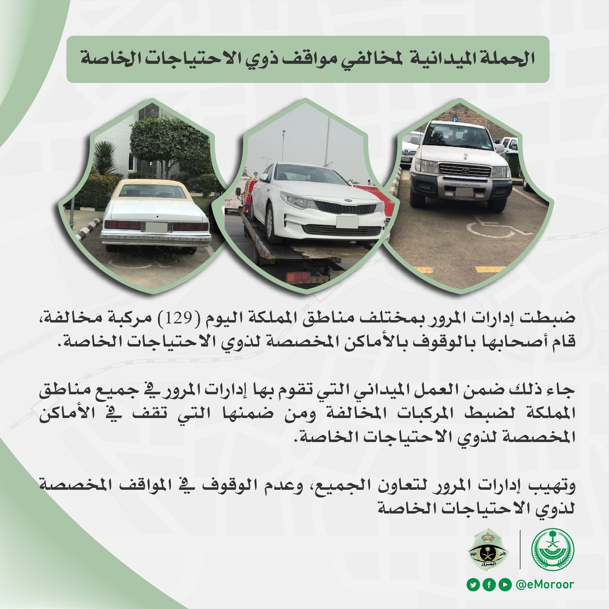ضبطت إدارات المرور في مختلف مناطق المملكة، اليوم الجمعة، 129 مركبة مخالفة وقف أصحابها في الأماكن المخصصة لذوي الاحتياجات الخاصة.