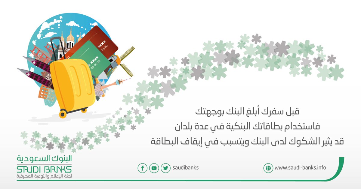 ونصحت البنوك السعودية عبر حسابها الرسمي بموقع “تويتر”: “قبل سفرك أبلغ البنك بوجهتك، لأن استخدام بطاقاتك البنكية في عدة بلدان قد يثير الشكوك لدى البنك ويتسبب في إيقاف البطاقة”.