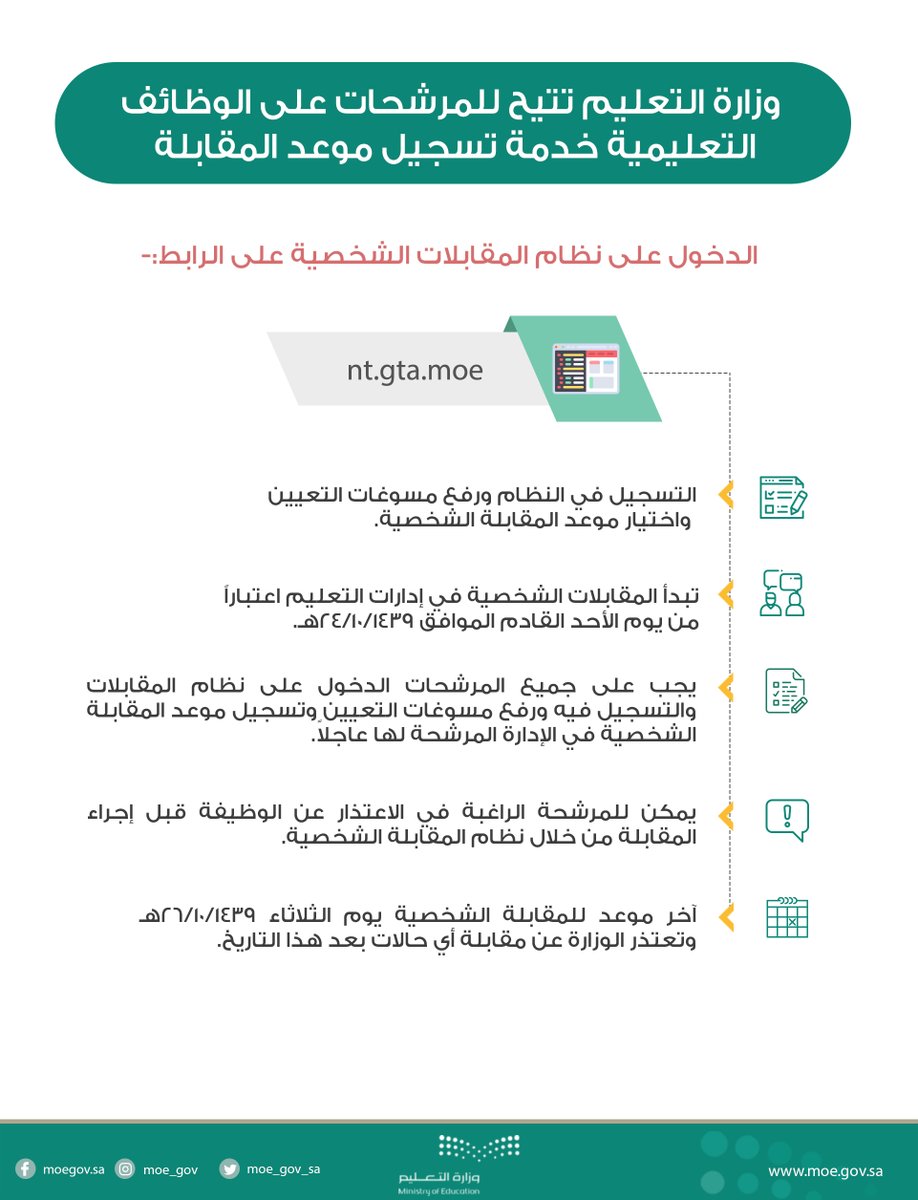 وأوضحت وزارة التعليم، في تغريدة عبر حسابها في “تويتر، أنه يمكن الدخول على نظام المقابلات عبر الرابط التالي (هنا).