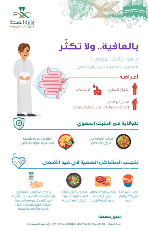 قدمت وزارة الصحة نصائح مهمة للوقاية من التلبك المعوي الذي قد ينتج عن الإفراط في تناول الطعام خلال عيد الأضحى المبارك.