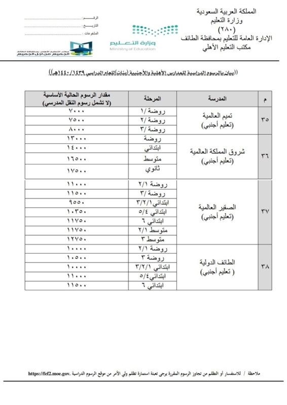 نشرت الإدارة العامة للتعليم بمحافظة الطائف ممثلةً في مكتب التعليم الأهلي على موقعها الإلكتروني بياناً بالرسوم الدراسية للمدارس الأهلية والأجنبية ( للبنين – البنات ) للعام الدراسي 1439/ 1440هـ ، بعد أن تم اعتمادها من قبل وزارة التعليم.