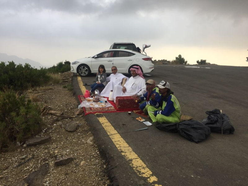 في موقف إنساني مؤثر، وثق مدير فرع مكتب هيئة الرياضة في منطقة عسير، معتق آل جرمان، قيام زائر لمتنزهات السودة باستضافة مجموعة من عمال النظافة، أثناء تنزهه هو وأسرته.