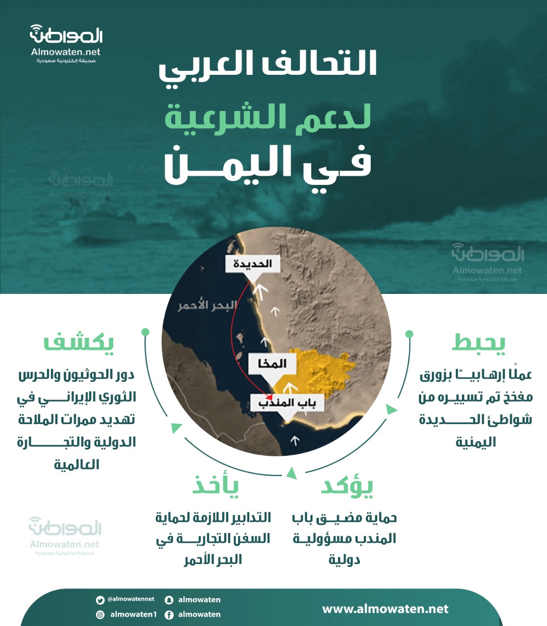 وكان التحالف قد أعلن اليوم إحباط عمل إرهابي بزورق مفخخ تم تسييره من شواطئ الحديدة اليمنية.