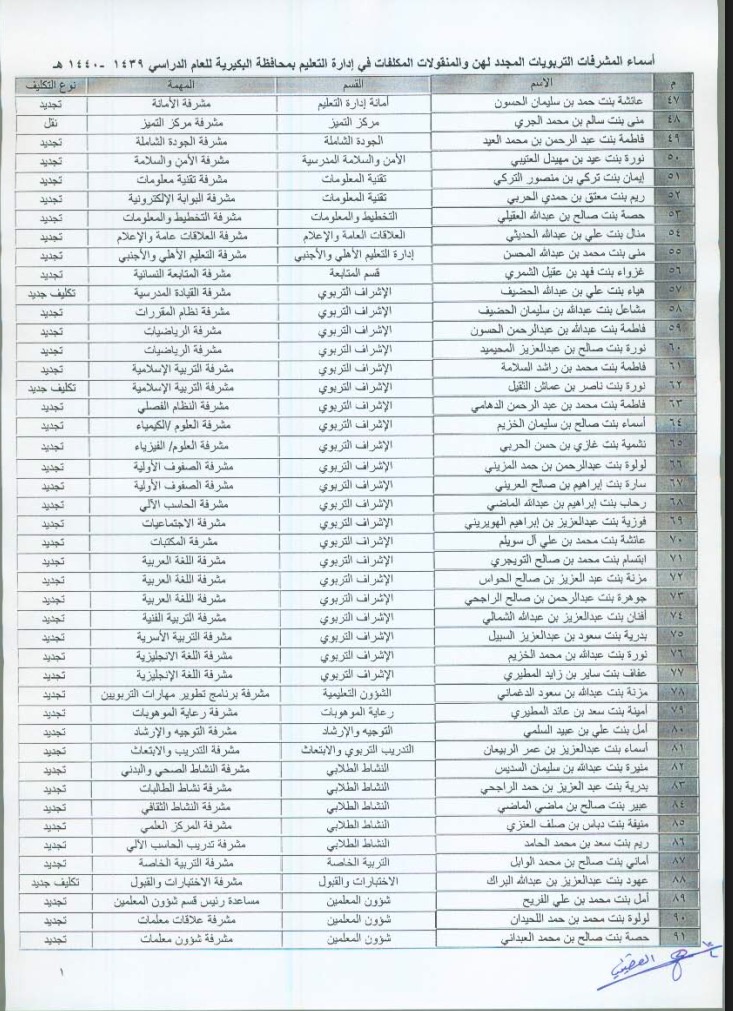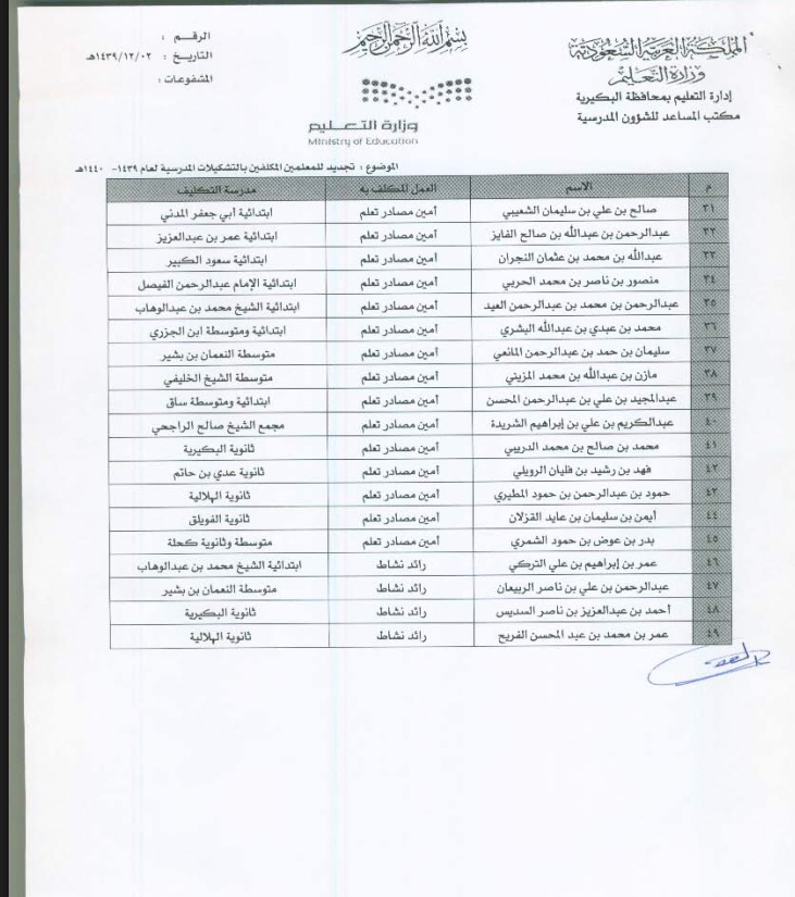 اعتمدت إدارة التعليم في البكيرية، ممثلة في مدير تعليم البكيرية د. خالد بن راجح الراجح، عددًا من التكليفات وقرارات التجديد لعدد من شاغلي الوظائف التعليمية (بنين وبنات)، وذلك للعمل ضمن التشكيلات الإشرافية والمدرسية للعام الدراسي 1439/ 1440هـ.