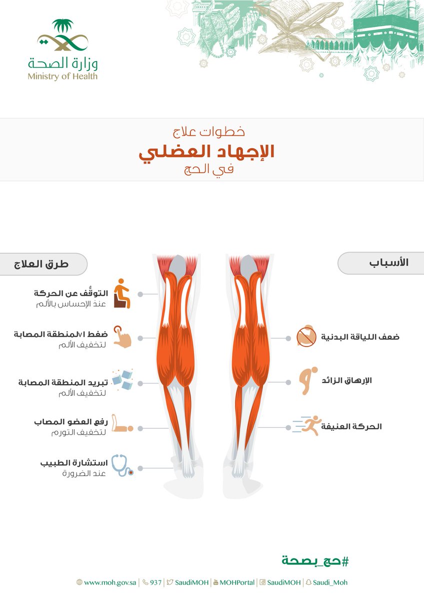 قدمت وزارة الصحة عدداً من الإرشادات للحجاج التي يجب اتباعھا عند الإصابة بالإجھاد العضلي أثناء أداء المناسك، وذلك بعد أن بینت الوزارة أھم أسباب الإصابة به.