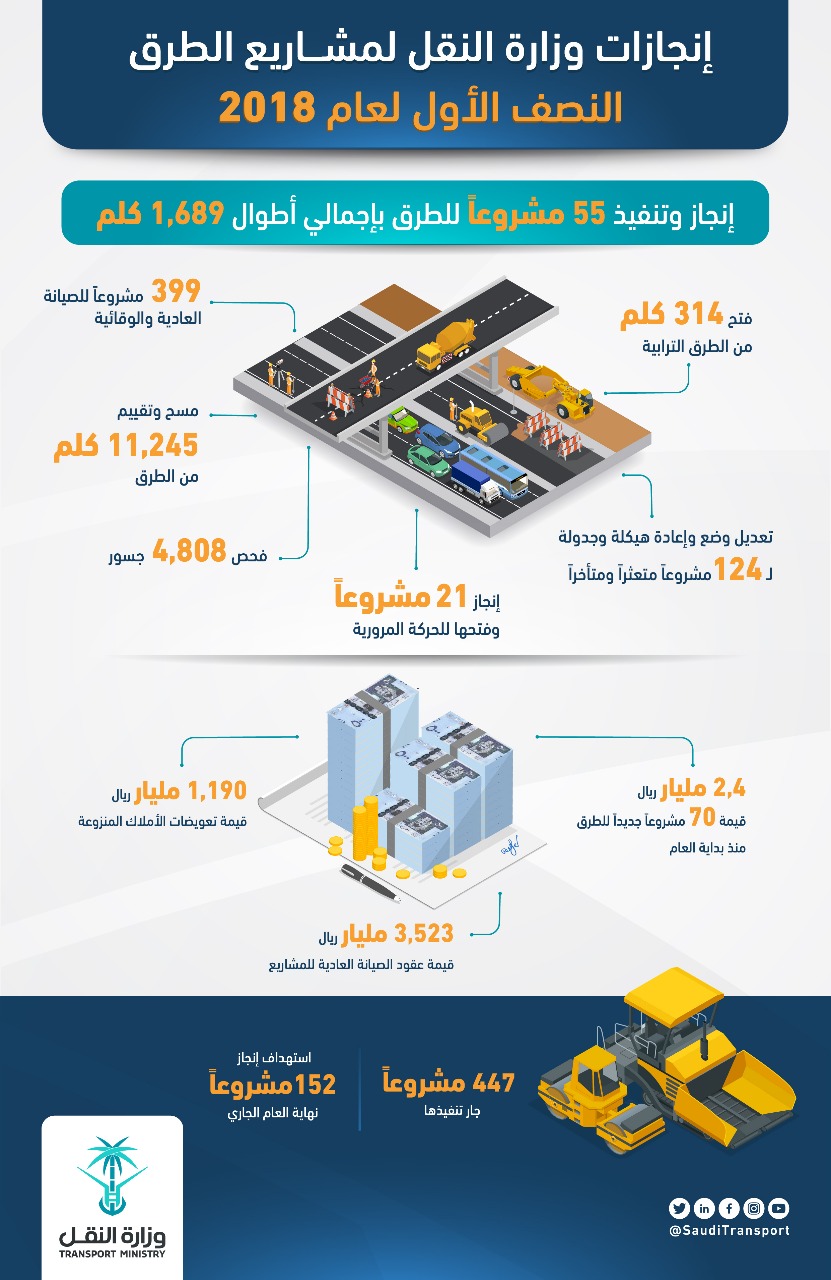 في إطار جهودها المتواصلة للارتقاء بشبكة الطرق في المملكة وتسهيل حركة تنقل السكان والبضائع، بما يعزز نمو القطاعات الاقتصادية المختلفة، أعلنت وزارة النقل أن عدد مشاريع الطرق التي تم الانتهاء من تنفيذها خلال النصف الأول من العام الجاري بلغ 55 مشروعاً، بإجمالي أطوال 1689 كلم وتكلفة إجمالية بلغت أربعة مليارات وتسعمائة وثمانية وسبعين مليون ريال.