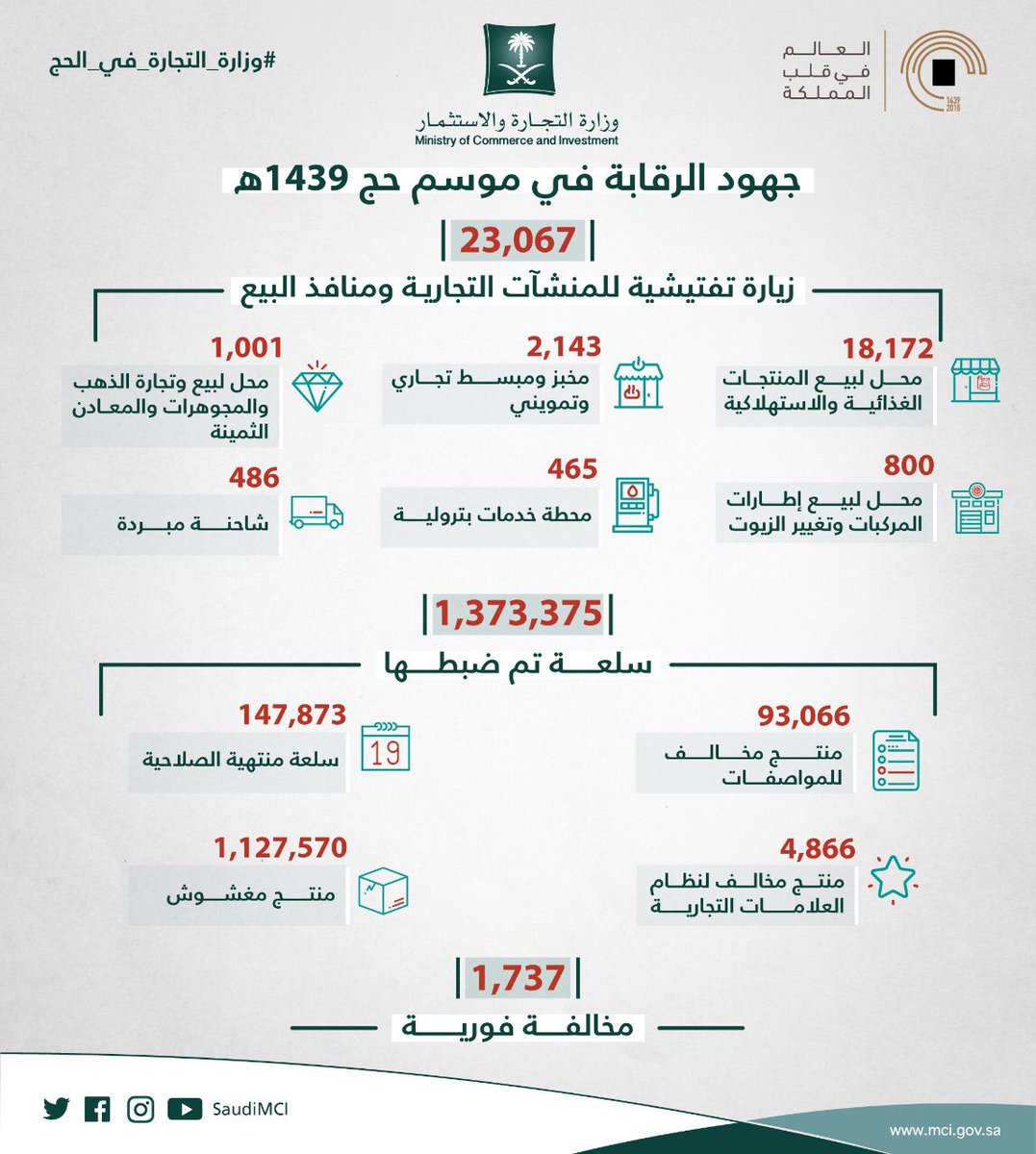 ووقفت الفرق الرقابية بالوزارة على (20.801) منشأة تجارية ومنفذ لبيع المنتجات الغذائية والاستهلاكية من بينها منافذ البيع والمخابز والشاحنات المبردة وسيارات الإمداد التمويني المتجولة في المشاعر المقدسة، كما شملت الجولات الرقابية التفتيش على (1.001) منشأة تجارية لبيع وتجارة الذهب والمجوهرات والمعادن الثمينة، و(800) منشأة لبيع إطارات المركبات وتغيير الزيوت، و(465) محطة للخدمات البترولية.