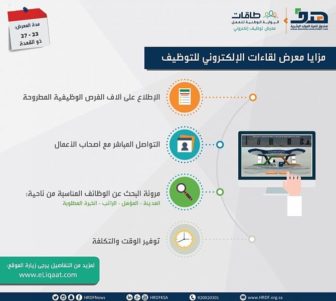 أبان صندوق تنمية الموارد البشرية (هدف)، أن معرض لقاءات الإلكتروني للتوظيف الثاني عشر، الذي بدأ الأحد الماضي ويستمر حتى بعد غدٍ الخميس، يحقق 4 مزايا للباحثين والباحثات عن عمل من جهة، وأصحاب العمل من جهة أخرى، وهي الاطلاع على آلاف الفرص الوظيفية المطروحة، والتواصل المباشر مع أصحاب الأعمال، ومرونة البحث عن الوظائف المناسبة من ناحية المدينة والمؤهل والأجر الشهري والخبرة المطلوبة، وتوفير الوقت والتكلفة.