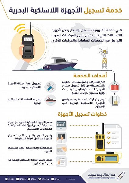 أعلنت هيئة الاتصالات وتقنية المعلومات عن إطلاق خدمة تسجيل الأجهزة اللاسلكية البحرية الهادفة إلى السماح للموردين باستيراد الأجهزة اللاسلكية البحرية بكميات تجارية بحيث يتم تسجيل هذه الأجهزة من قبل الموردين والحصول على الرخص اللازمة لها عند البيع.