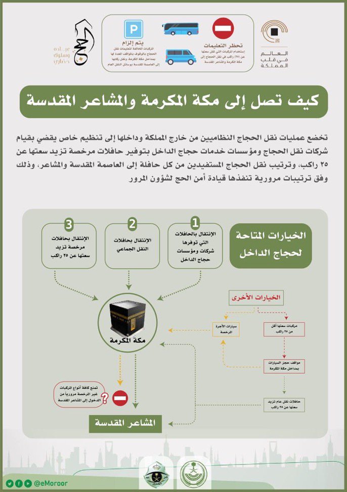 نشرت وزارة الداخلية، بالتنسيق مع الأمن العام، إنفوجرافيك يوضح الخيارات المتاحة لحجاج الداخل للوصول إلى مكة المكرمة والمشاعر المقدسة لأداء فريضة الحج.