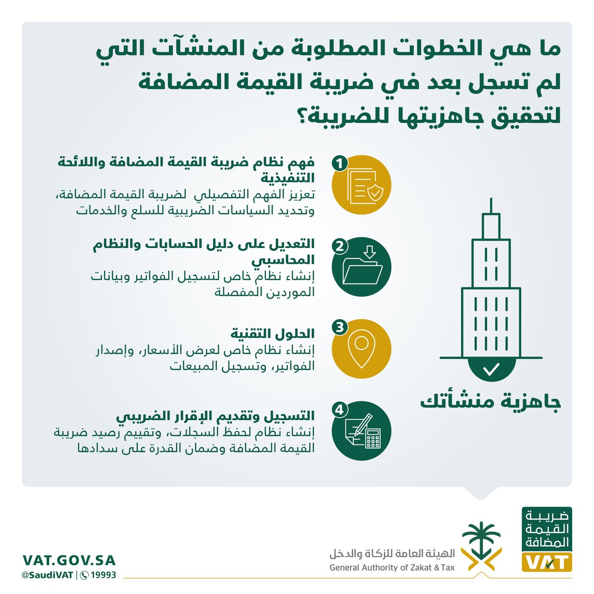 نشرت الهيئة العامة للزكاة والدخل، إنفوجرافيك يوضح مجموعة من الخطوات المطلوبة من المنشآت التي لم تسجل بعدُ في ضريبة القيمة المضافة لتحقيق جاهزيتها للضريبة.