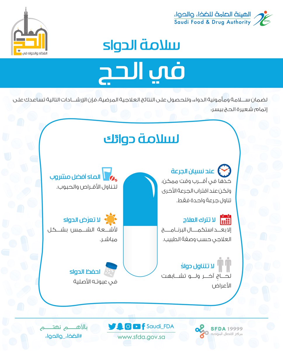 وجهت الهيئة العامة للغذاء والدواء 4 نصائح مهمة لضيوف الرحمن؛ لضمان سلامة ومأمونية الدواء وللحصول على النتائج العلاجية المرجوة.