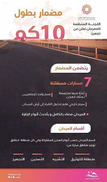 وجهزت اللجنة المنظمة لمهرجان ولي العهد للهجن، مضمارًا لمنافسات سباقات الهجن بطول 10 كيلو مترات،ويتضمن 7 مسارات مسفلتة، ثلاثة منها مخصصة لـمـُلّاك الهجن، ومسارًا واحدًا للإعلاميين، محاطة بسياج خارجي يمنع لدخول الأفراد إلى أرض الميدان.