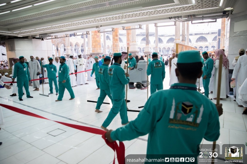 وأكد المدير العام للشؤون الخدمية، محمد بن مصلح الجابري، أن الإدارة تعمد إلى اتباع آلية في الحزام الأمني والسرعة في الأداء بما يسهم في التيسير على ضيوف البيت العتيق في ممارسة شعائرهم الدينية بكل يسر وسهولة، حيث يغسل المسجد الحرام على مدار 24 ساعة متواصلة وتوزع العمل على ثلاث ورديات مختلفة تتداخل مع بعضها في الأوقات؛ وذلك لضمان أداء سير العمل، وتقوم الورديات العاملة بتنظيف الساحات والمصليات، إضافة إلى المكبرية وصحن المطاف في 30 دقيقة فقط.