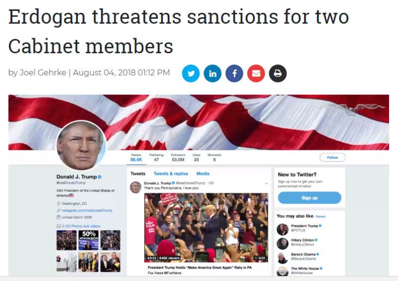 وأمر الرئيس التركي رجب طيب أردوغان بمصادرة أموال اثنين من كبار مسؤولي الإدارة الأميركية، حيث أمر بفرض عقوبات عليهما كجزء من نزاع مستمر حول احتجاز القس الأميركي أندرو برانسون، والذي كانت محكمة تركية قد فرضت عليه الإقامة الجبرية عوضاً عن الحبس، غير أن رجب طيب أردوغان لا يزال يرى أن العناد السياسي مع الولايات المتحدة هو العامل الرئيسي للانتصار في تلك المعركة غير المتكافئة، وفقًا لما قالته صحيفة واشنطن إكزامينر الأميركية.