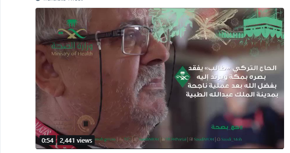 ونشرت الصحة مقطع فيديو يبين قصة الحاج طالب ومعاناته التي انتهت بالفرحة والسعادة بعودة نور الحياة له من جديد في المملكة.
