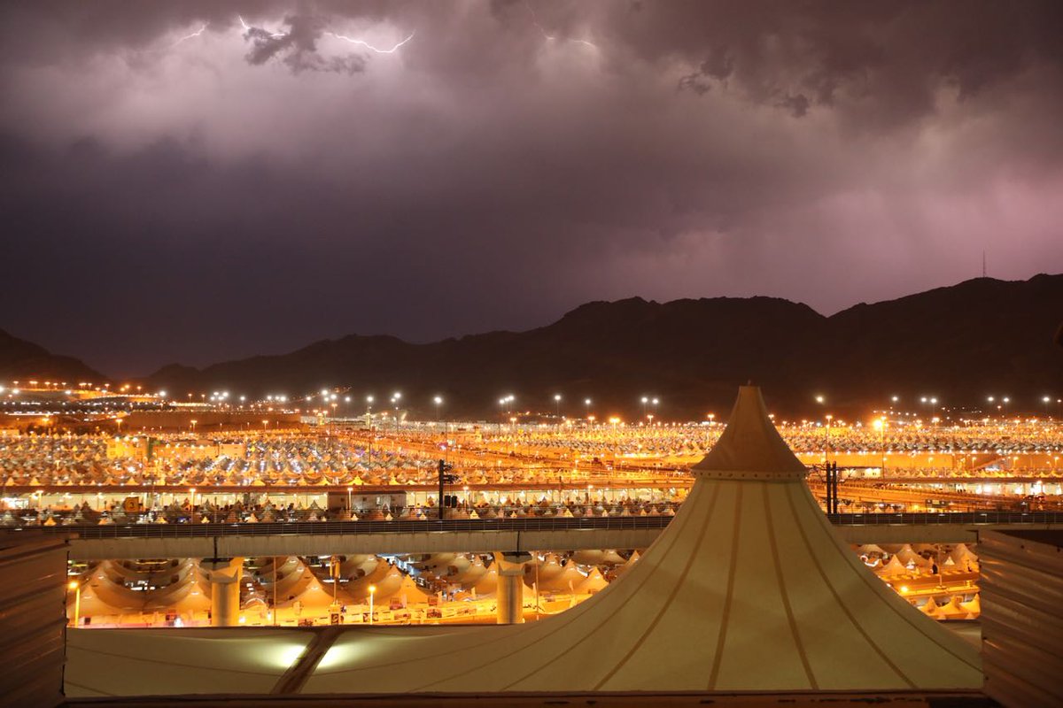 والصورة عبارة عن خيام الحجاج ليل اليوم الأحد، وفي الخلفية يلمع البرق ليعطي للمشهد شكلًا جذابًا.
