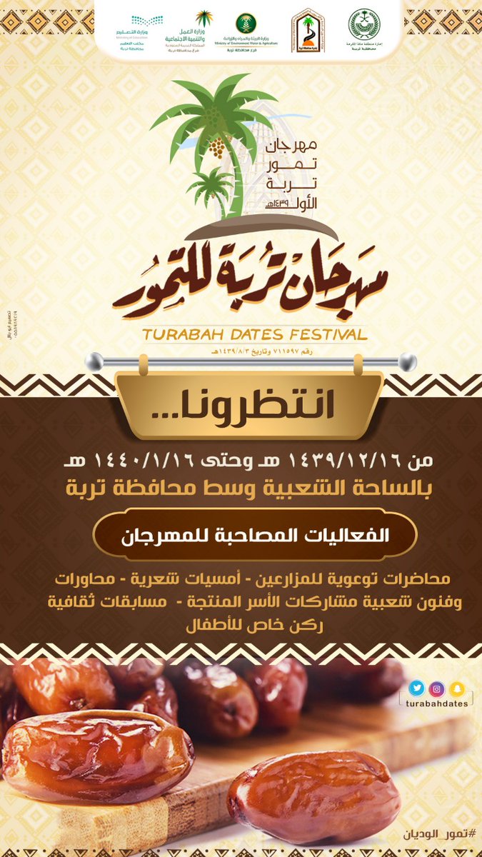 ينطلق مهرجان تمور محافظة تربة الأول، بعد عيد الأضحى المبارك بمشيئة الله، وذلك خلال الفترة من 16 / 12 / 1439هـ وحتى 16 / 1 / 1440هـ، بالساحة الشعبية وسط المحافظة.