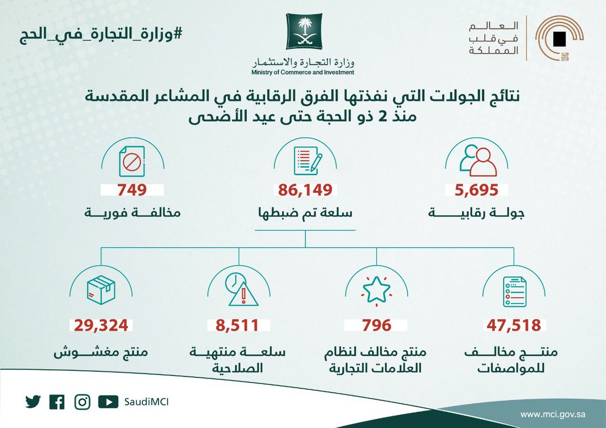 نفذت الفرق الرقابية التابعة وزارة التجارة والاستثمار 5.695 جولة تفتيشية في المشاعر المقدسة والمنطقة المركزية، على المنشآت التجارية لمراقبة منافذ البيع والتحقق من وفرة السلع التموينية والغذائية وصلاحيتها للاستهلاك وضمان عدم وجود أي مخالفات خلال الفترة من 2- 10 من شهر ذو الحجة الجاري.