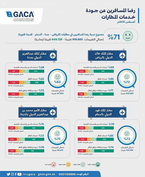أعلنت الهيئة العامة للطيران المدني، إحصائية شهر أغسطس الماضي لمستوى رضا المسافرين عن جودة الخدمات في كل من (مطار الملك خالد الدولي بالرياض، ومطار الملك عبدالعزيز الدولي بجدة، ومطار الملك فهد الدولي بالدمام، ومطار الأمير محمد بن عبدالعزيز الدولي بالمدينة المنورة)، وشارك فيها أكثر من (900) ألف مسافر، حيث بلغت نسبة رضا المسافرين في شهر أغسطس 71%.