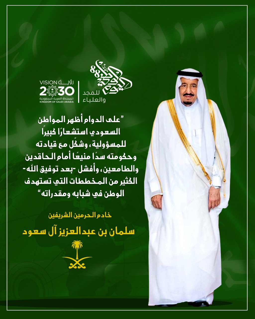في ذكرى اليوم الوطني الـ88 للمملكة نستذكر كلمات خادم الحرمين الشريفين الملك سلمان بن عبدالعزيز، حفظه الله، تجاه الوطن والمواطن، هذه الكلمات المسجلة بكلمات من ذهب في وجدان الوطن، والتي نستلهم منها اهتمام القيادة بالوطن والنهوض بالمواطن في شتى المجالات.