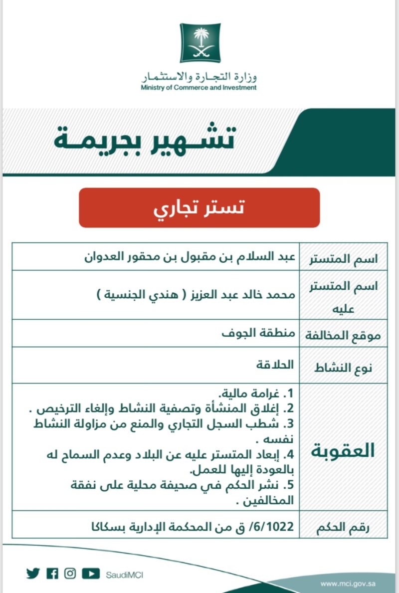 وجاء في الحكم الصادر من المحكمة الجزائية بسكاكا: فرض غرامة مالية على المخالفين وإغلاق المنشأة وتصفية النشاط وشطب السجل التجاري وإلغاء الترخيص والمنع من مزاولة النشاط التجاري في محل المخالفة، بالإضافة إلى عقوبة الإبعاد للمتستر عليه عن البلاد بعد تنفيذ الحكم وعدم السماح له بالعودة إليها للعمل، والتشهير عبر نشر الحكم في صحيفة محلية على نفقة المخالفين.