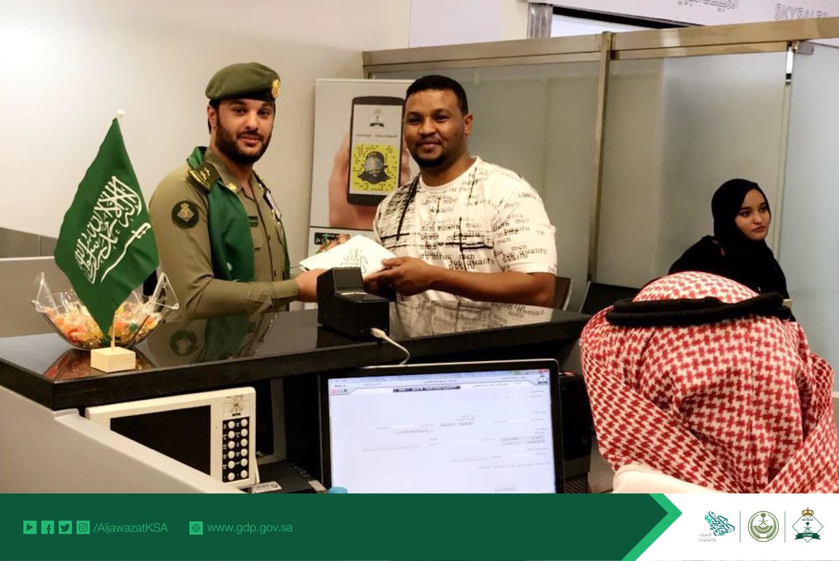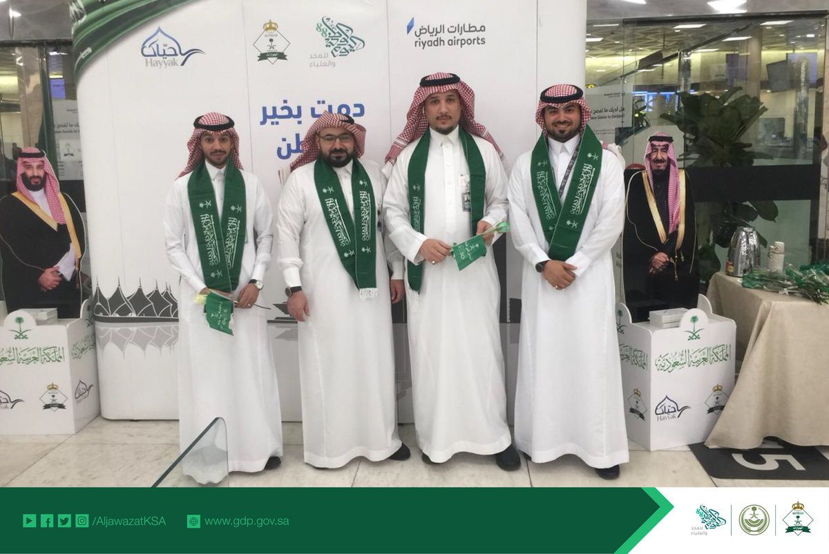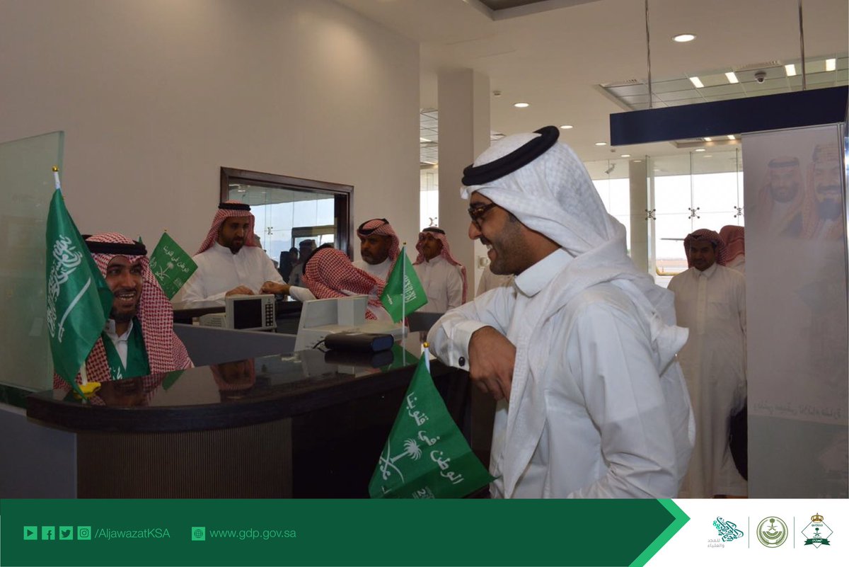 احتفلت إدارات المديرية العامة للجوازات بمختلف المنافذ والمطارات باليوم الوطني الـ 88 للمملكة بإقامة العديد من الفعاليات وتوزيع الحلوى والأعلام والهدايا التذكارية على الركاب المسافرين على الرحلات الدولية والداخلية واستقبالهم وتوديعهم بالورود .