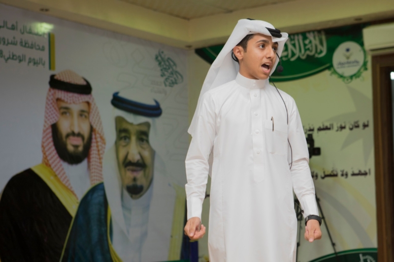 بعد ذلك قدمت مشاركة عن مناطق المملكة قدمتها طالبات مدارس الأجيال الأهلية للبنات، عقب ذلك ألقيت قصيدة شعرية بهذه المناسبة قدمها د. نواف الحكمي، ففقرة الزامل والفولكلور الشعبي. ثم فقرة شعرية رثائية لابنة شهيد الوطن الشهيد مرزوق الصيعري رحمه الله عن ما يقدمه الأبطال والمرابطون بالحد الجنوبي من تضحيات للدفاع عن الوطن والمواطن وحماية المقدسات والمقدرات، ثم مشاركة متميزة لبراعم جمعية بينات لتحفيظ القرآن الكريم بعنوان “عاش سلمان” تلى ذلك قصيدة شعرية نبطية عن الوطن قدمها الشاعر المتميز: ضيف الله السميري.